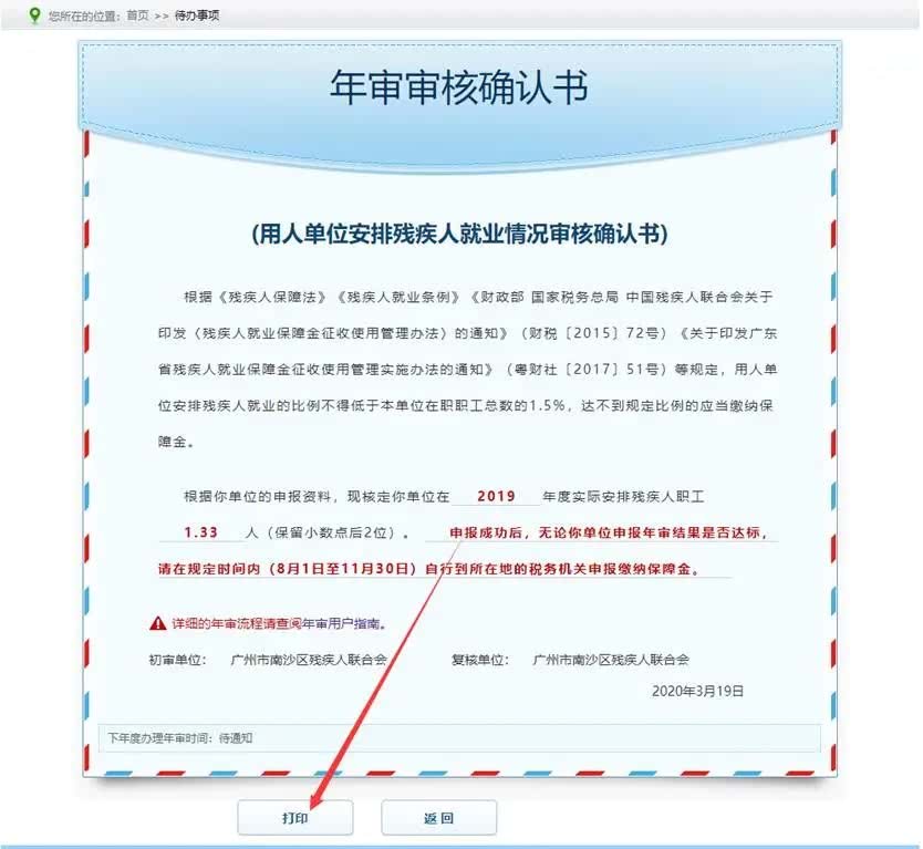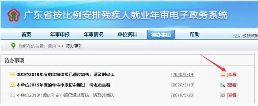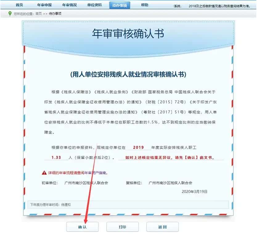 第九步:打开右上角【待办事项】,显示待办事项列表,查看“年审申报已通过复核”事项,系统显示《年审审核确认书》,点击下方的【确认】,申报年审完毕(如用人单位需存档,点击【打印】生成《用人单位安排残疾人就业情况审核确认书》)。