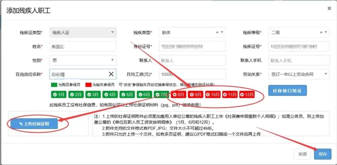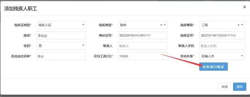1. 如实完整录入残疾人职工信息后,点击【社保接口验证】