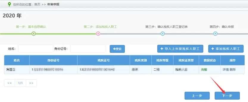 3.完成所有残疾人职工信息录入后,点击【下一步】。