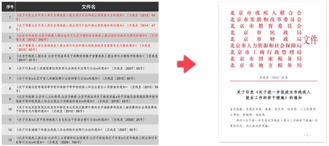 2018年 6月15日 , 北京市残联、市社保局、市财政局等九部门联合出台关于印发《关于进一步促进本市残疾人就业工作的若干措施》的通知(残发〔2018〕26号)