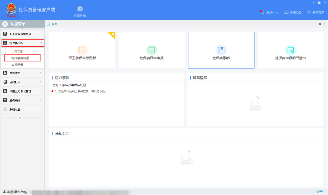 用人单位先在社保经办机构核定缴费金额,之后启动“单位社保费管理客户端”,输入申报密码,进入系统首页。