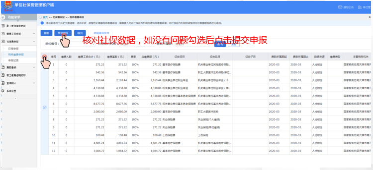 核对数据,如没有问题,勾选,点击“提交申报”。