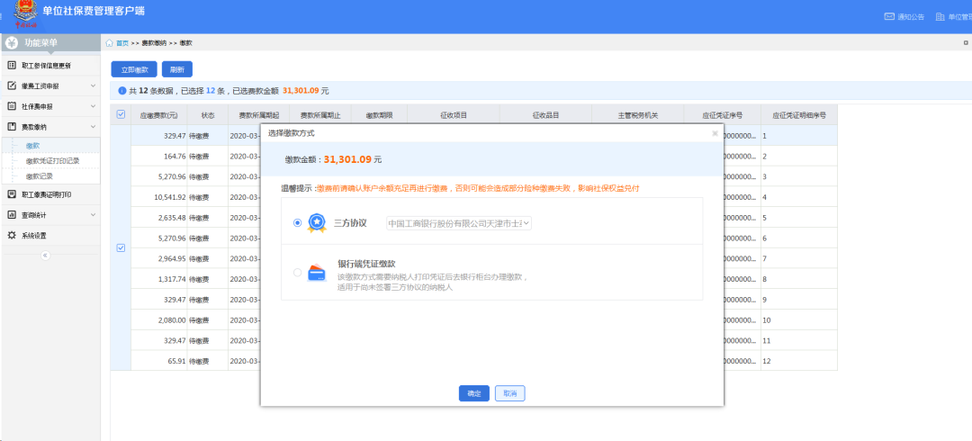 签订三方协议的用人单位,可以使用三方协议缴费,也可以打印《银行端查询缴税凭证》经银行临柜方式缴费。