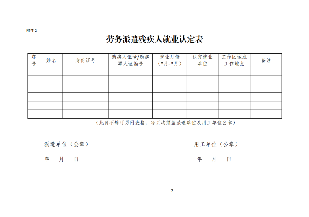 2、《劳务派遣残疾人就业认定表》