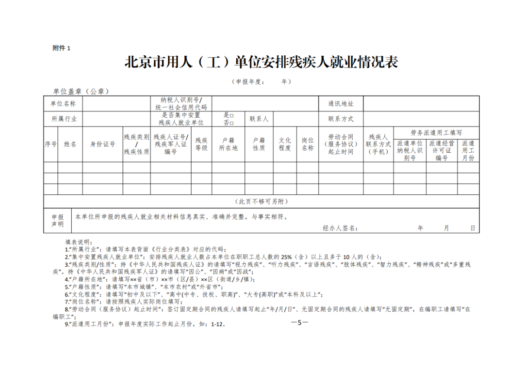 附件:1、《北京市用人(工)单位安排残疾人就业情况表》