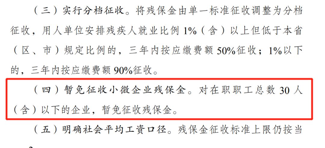 支持小微企业有关政策。自2020年1月1日起至2022年12月31日止,即自2020年(含)起3个年度缴费申报期内,我省在职职工人数在30人(含)以下的企业,暂免征收残保金。
