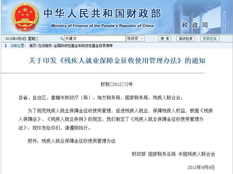 2. 《财政部、国家税务总局、中国残疾人联合会关于印发〈残疾人就业保障 金征收使用管理办法〉的通知》(财税〔2015〕72号)规定,