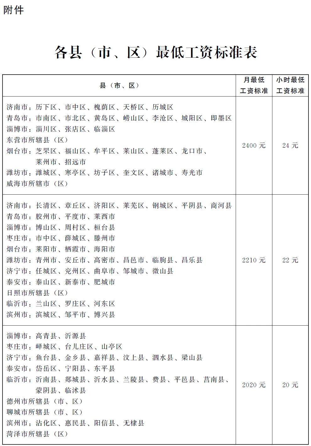 一、调整后的全省月最低工资标准按区域分为三档,依次为2400元、2210元、2020元;小时最低工资标准依次为24元、22元、20元。各县(市、区)最低工资标准见附件。