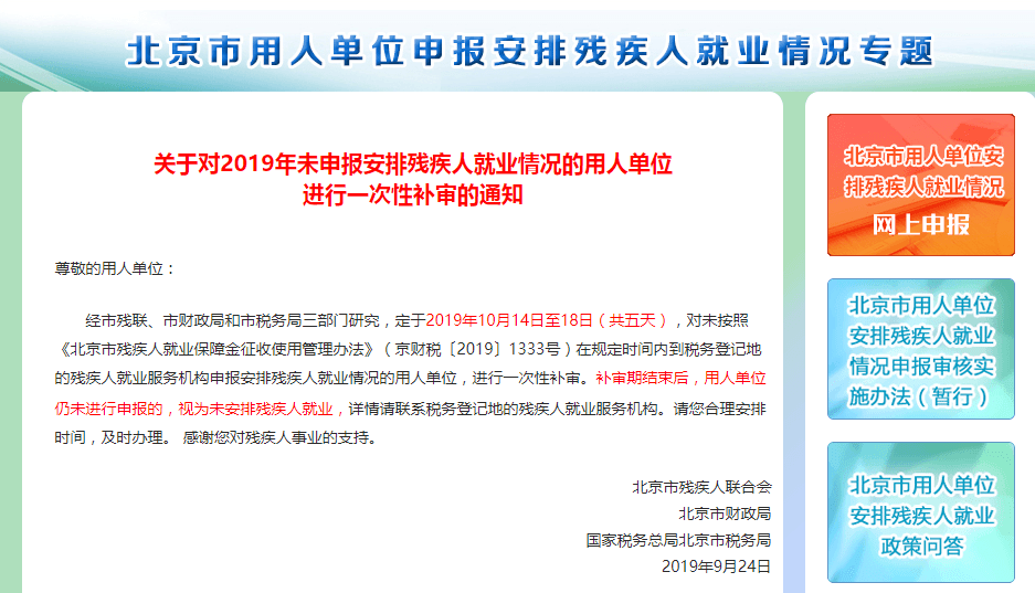 经市残联、市财政局和市税务局三部门研究,定于2019年10月14日至18日(共五天),对未按照《北京市残疾人就业保障金征收使用管理办法》(京财税〔2019〕1333号)在规定时间内到税务登记地的残疾人就业服务机构申报安排残疾人就业情况的用人单位,进行一次性补审。补审期结束后,用人单位仍未进行申报的,视为未安排残疾人就业,详情请联系税务登记地的残疾人就业服务机构。请您合理安排时间,及时办理。感谢您对残疾人事业的支持。
